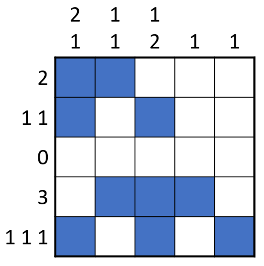 數織(Nonogram) 是一種邏輯遊戲,以猜謎的方式繪畫黑白點陣圖。在一個 n×n 方陣網格中,每一列 (row) 和行 (column) 都有一組數,玩家需根據它們來填滿或留空格子,最後就可以由此得出一幅圖畫。例如,「2 1」的意思就是指該行或列上塗黑的格子有2段,分別佔了2和1格,而每條線最少要由一個空格分開(如下圖)。