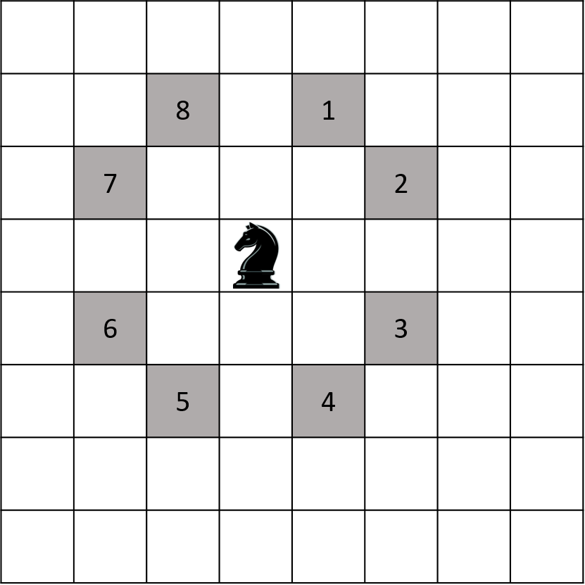 在一個 $n \times n$ 的西洋棋盤上放置 $m$ 個騎士,並依序編號為 $1 \sim m$。接下來按照編號順序依次移動騎士,在西洋棋中騎士可以移動的 8 個方向如下圖。