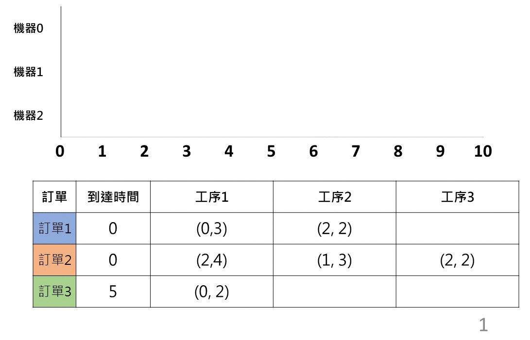為了要有效率又公平地完成這些訂單,我們將用下列方法來決定每一回合要做的工序,直到所有的工序都被做完為止: