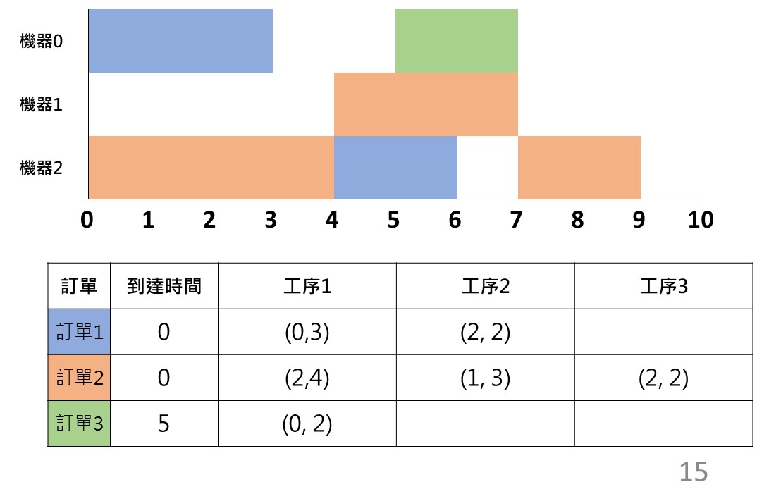 要解決這個問題,您需要記住以下狀態。首先,您需要記住所有訂單的就緒時間,以及您已完成的工序數量,以便您知道下一個工序是什麼。此外,您還需要記住所有機器的就緒時間,以便您可以計算在這台機器上運行的工序的完成時間。在選擇在機器上運行工序後,您需要更新有關訂單和機器的信息。