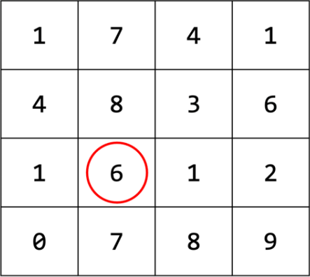 舉例而言,下圖為地圖上每個位置的高度,假設索引值從 0 開始,位置 (2, 1) 符合神秘郵件上給的提示,寶藏就位於此處。