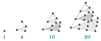 一個四面體,每層都是三角形數,例如第一層為 1,第二層為 1+2=3,第三層為 1+2+3 = 6。