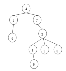下圖是一個例子,每個成員是一個圈起來的號碼,劃線相聯的表示上面的點是下面點的 parent。編號 $4$ 是根,有兩個孩子 $1$ 與 $7$。編號 $6, 9, 3, 8$ 都沒有孩子, $h(6)=h(9)=h(3)=h(8)=0$,此外 $h(2)=2$ 因為 $9$ 與他隔兩代。你可以看出來 $h(5)=h(1)=1$,$h(7)=3$, $h(4)=4$, 所以高度總和是 $11$。