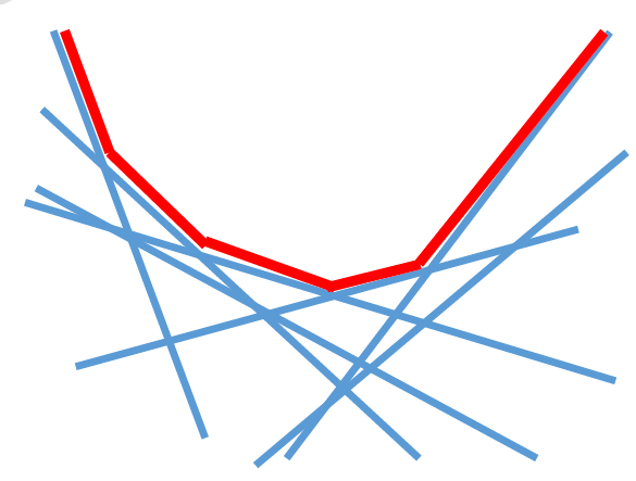給 N 個線性函數(一次函數),另外定義 F 是這些函數的最大值,現在給 m 個 x 值,要計算 F 在這些點的函數值總和,也就是對每一個 x 值,要計算這些線性函數的最大值。直接的做法全部計算取最大,總共需要O(mn),效率不佳。請看下圖。藍線是這些線性函數,紅線就是F,他必定會形成一個(向下)凸的形狀,而且是一段一段的,每一段都是原來的某個藍線(函數),如果我們可以找出這個紅線,計算這些函數值就沒問題了。我們需要一個觀察:若 f 與 g 是兩個線性函數,f 的斜率小於 g,那麼,在兩線的交點以前是 f 大,以後是 g 大。我們可以將這些直線根據斜率排序,然後逐一將直線加入 F 。這一題另外也有分治的演算法可以做,在後續章節中會再出現。