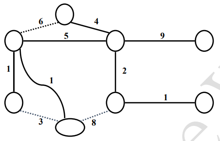 下圖是一個例子,其中實線代表最小生成樹的邊,虛線代表沒有挑選的邊,圖中有 8 個點,一定剛好有 7 個邊。